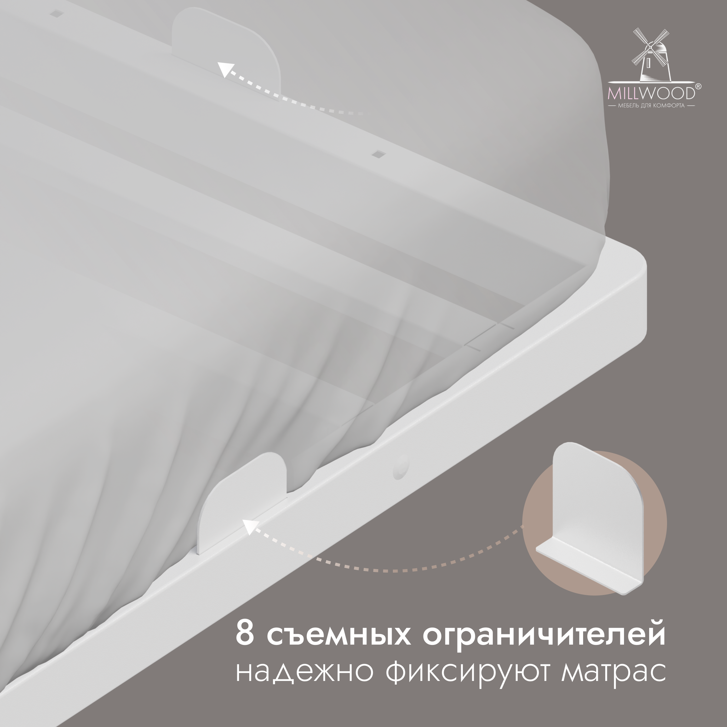 • 8 съёмных ограничителей матраса — легко снять или установить, чтобы разместить матрас большего размера.