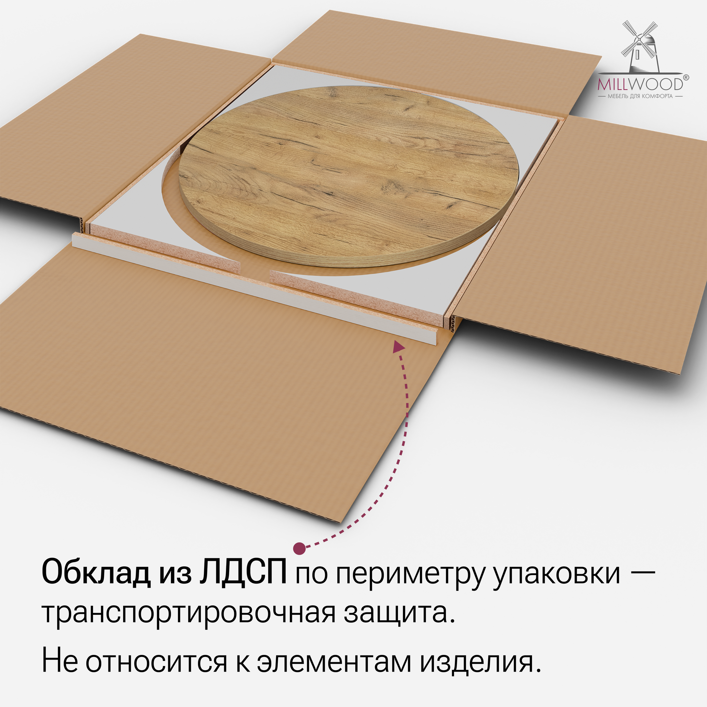 Круглая столешница от Милвуд отлично подходит для столов на кухню, в гостиную или офис. Легкая текстура древесины идеальна для всех видов бытовых и офисных столов. Она изготовлена из ЛДСП толщиной 18 или 36 мм и облицована кромкой 2 мм. Столешница прочна и надежна, не боится влаги, высоких температур и проста в уходе.