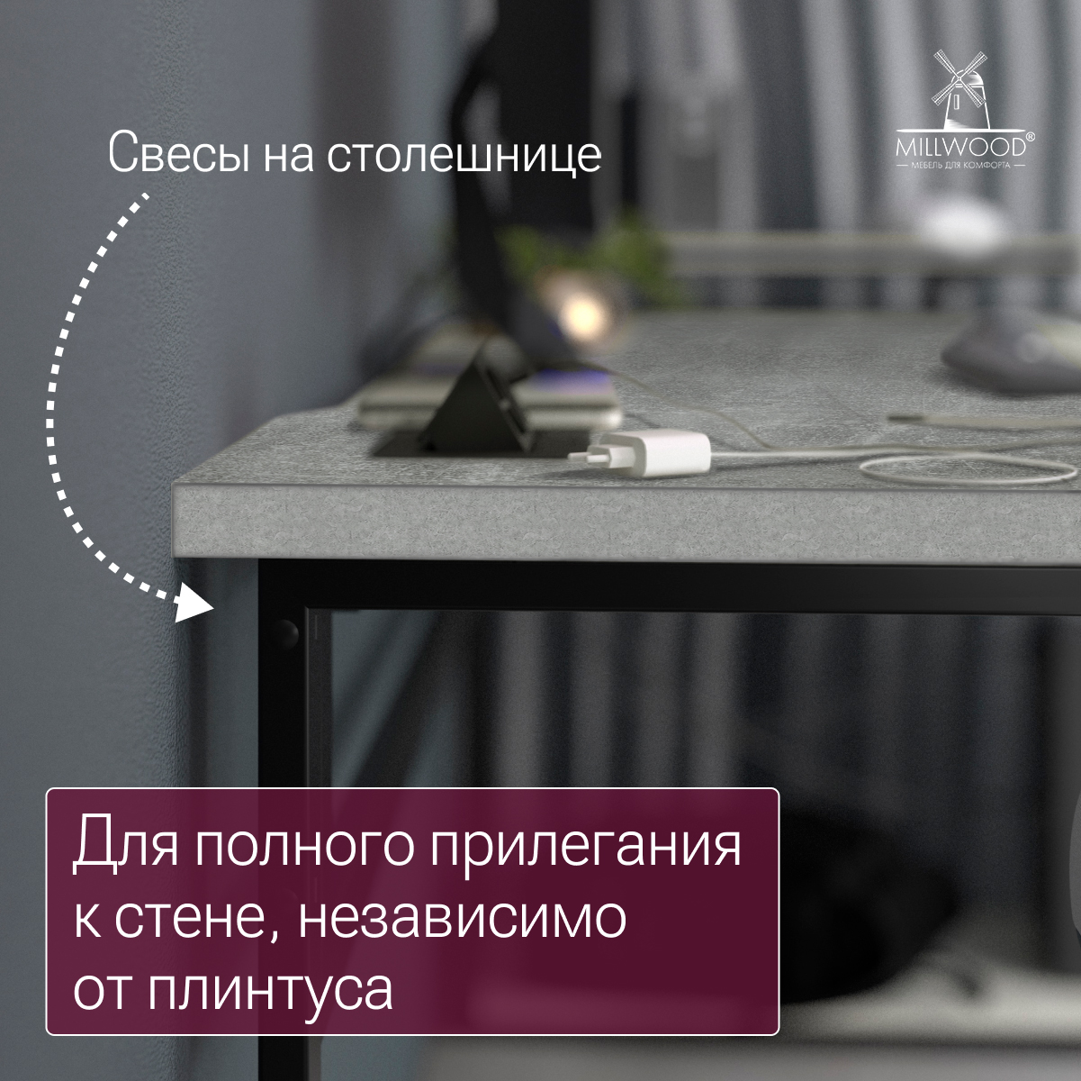 - Обратная сторона столешницы выступает за пределы подстолья, что позволяет установить стол вплотную к стене, а напольный плинтус не будет помехой.