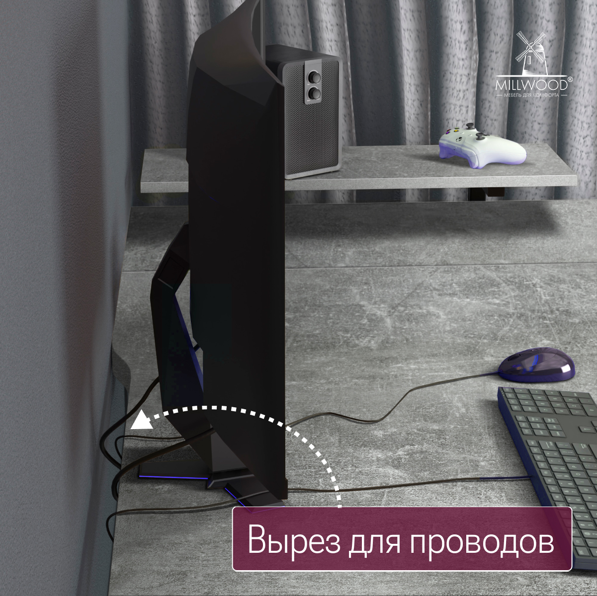 - Эргономичный вырез на столешнице для комфортной работы. На обратной стороне столешницы предусмотрен дополнительный вырез, который позволяет скрыть провода и создает аккуратный вид рабочего пространства.