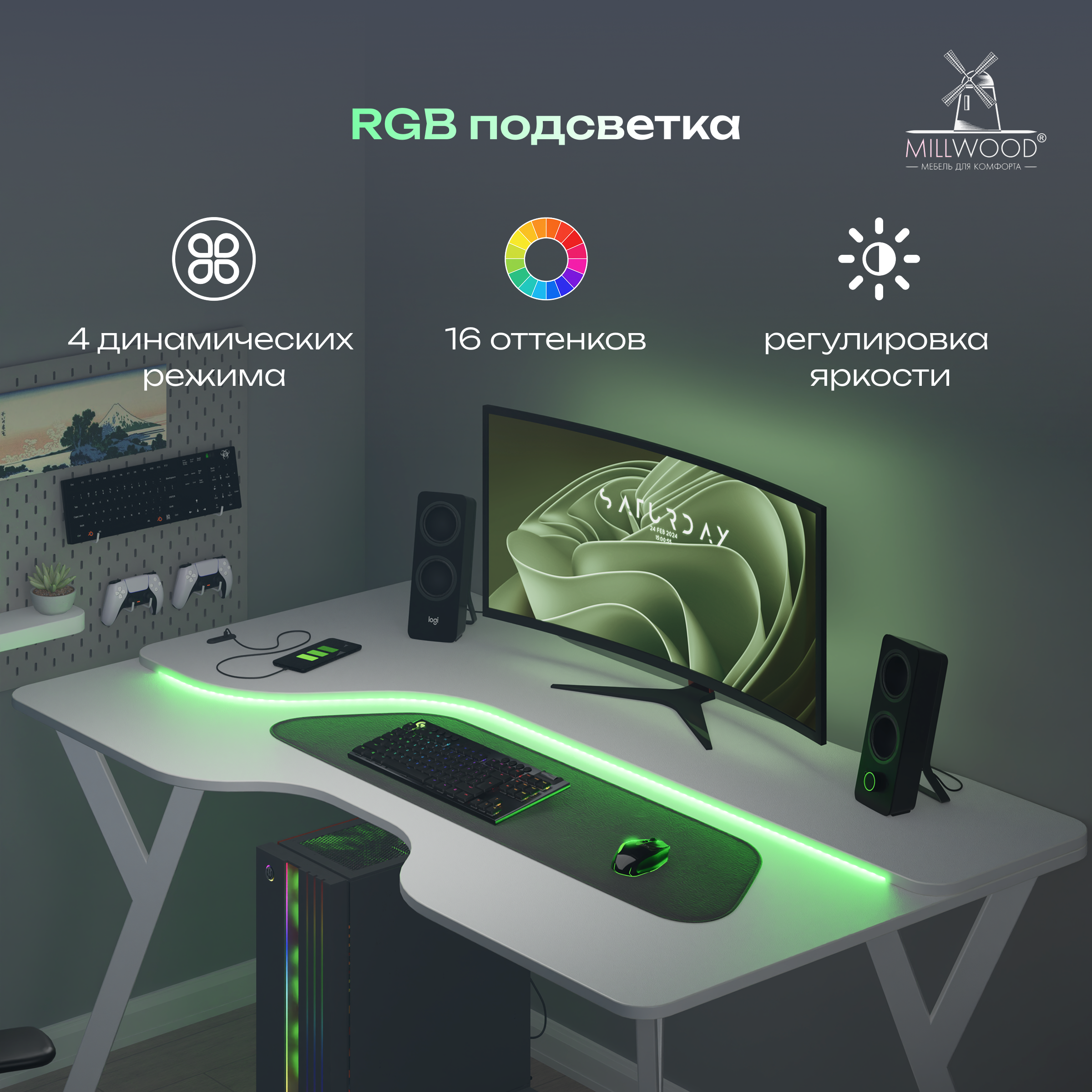 ◾ RGB‑подсветка с пультом: 16 оттенков, 4 динамических режима и плавная регулировка яркости — создаёт атмосферу уюта и визуального фокуса.