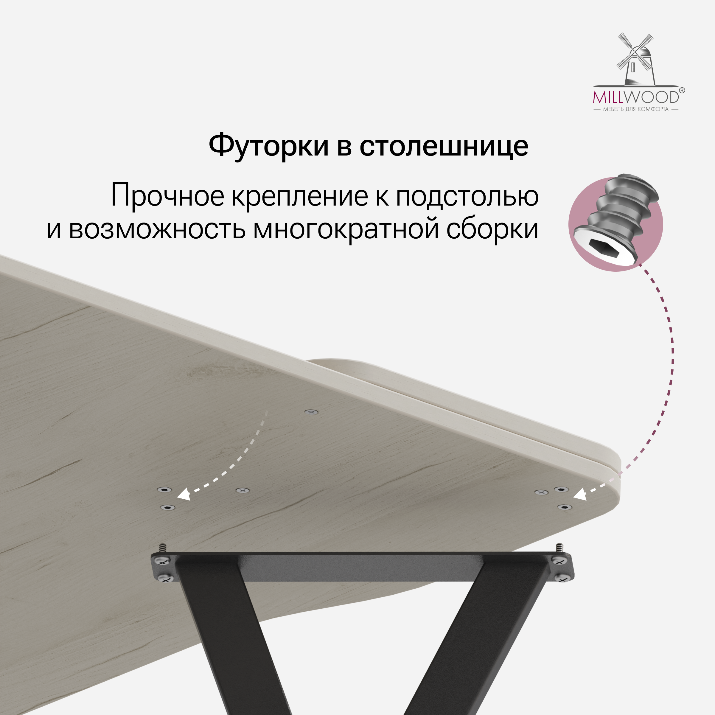 ◾ Футорки в столешнице — прочное крепление к подстолью и возможность многократной сборки без потери качества.