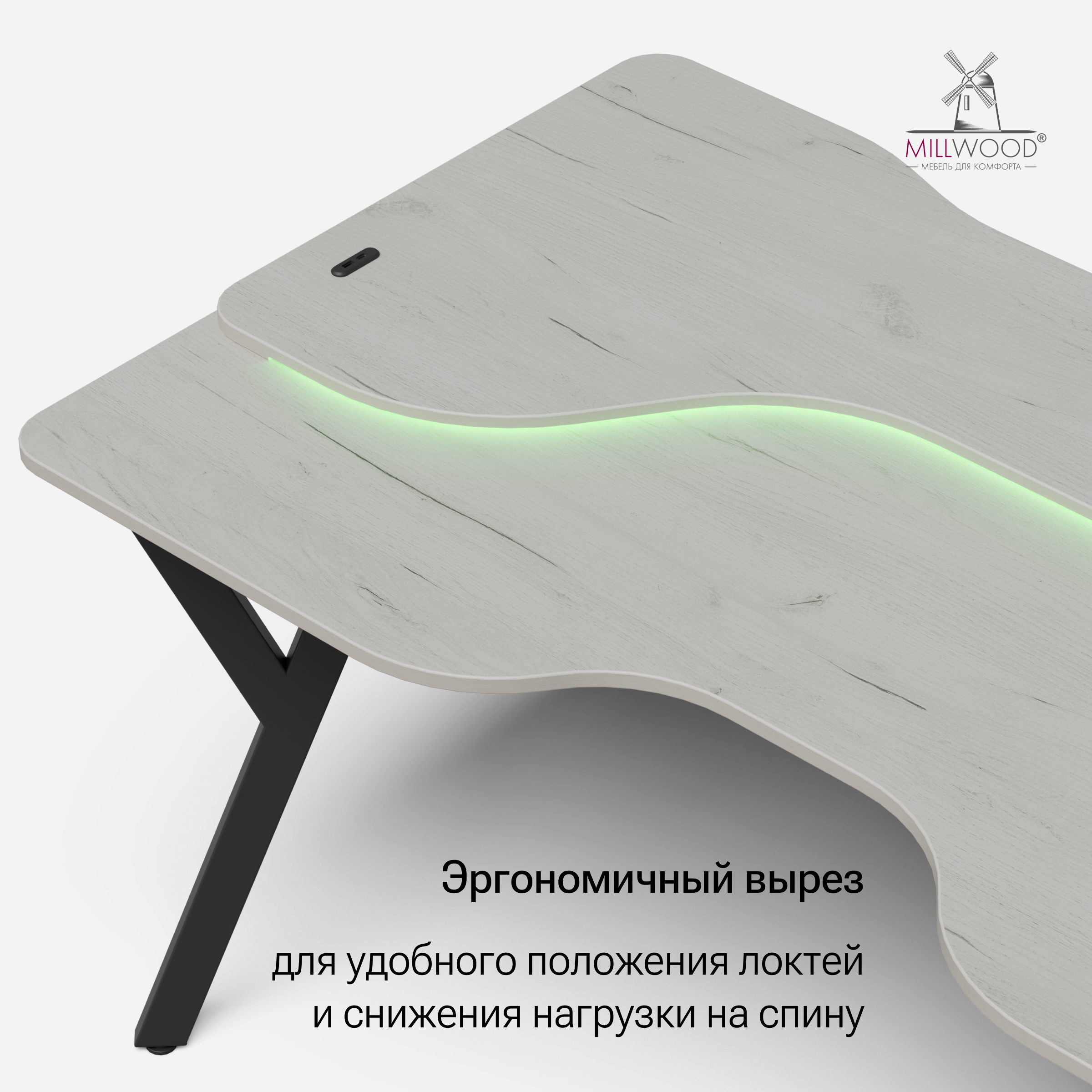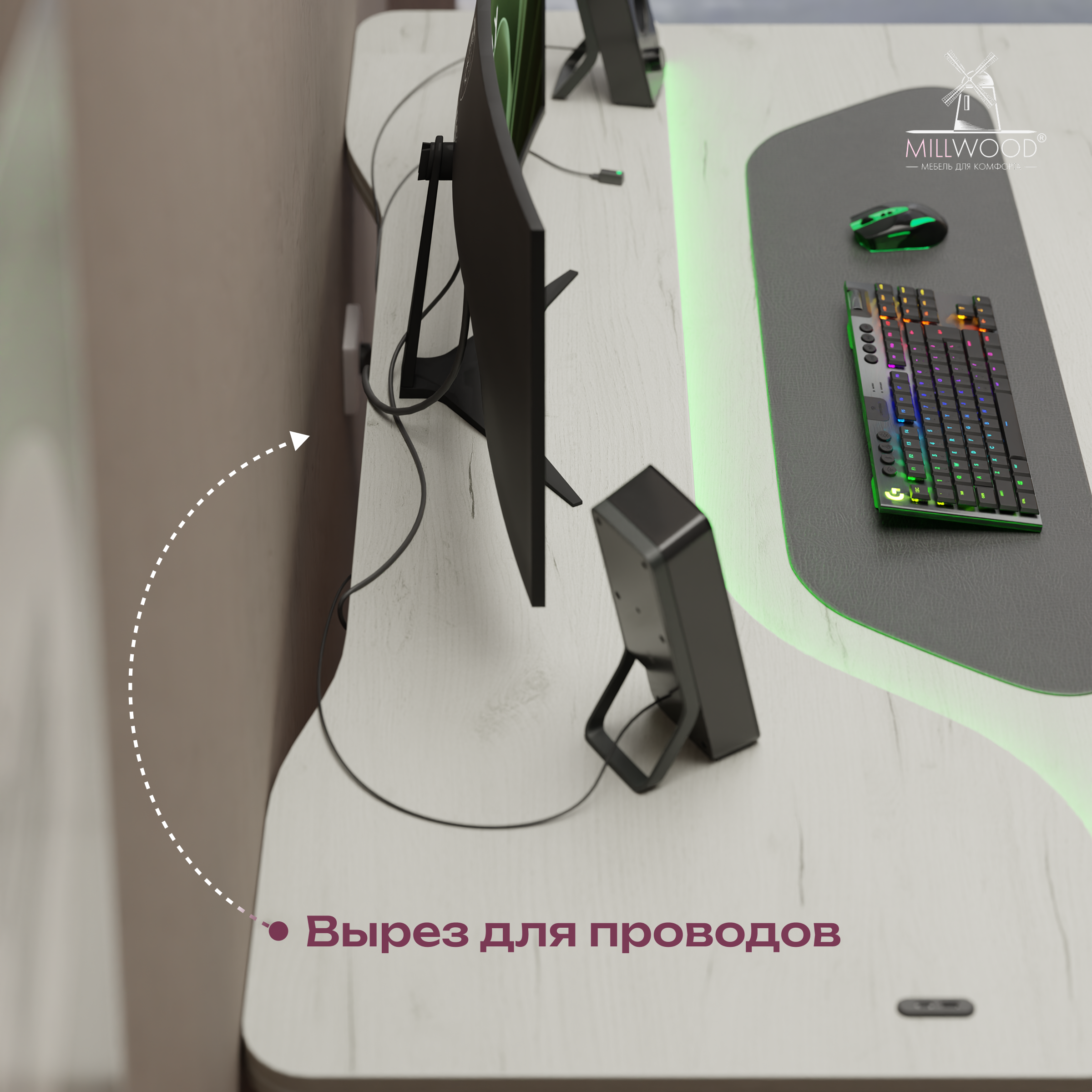 ◾ Дополнительный вырез на обратной стороне столешницы помогает скрыть провода и сохранить аккуратный вид.