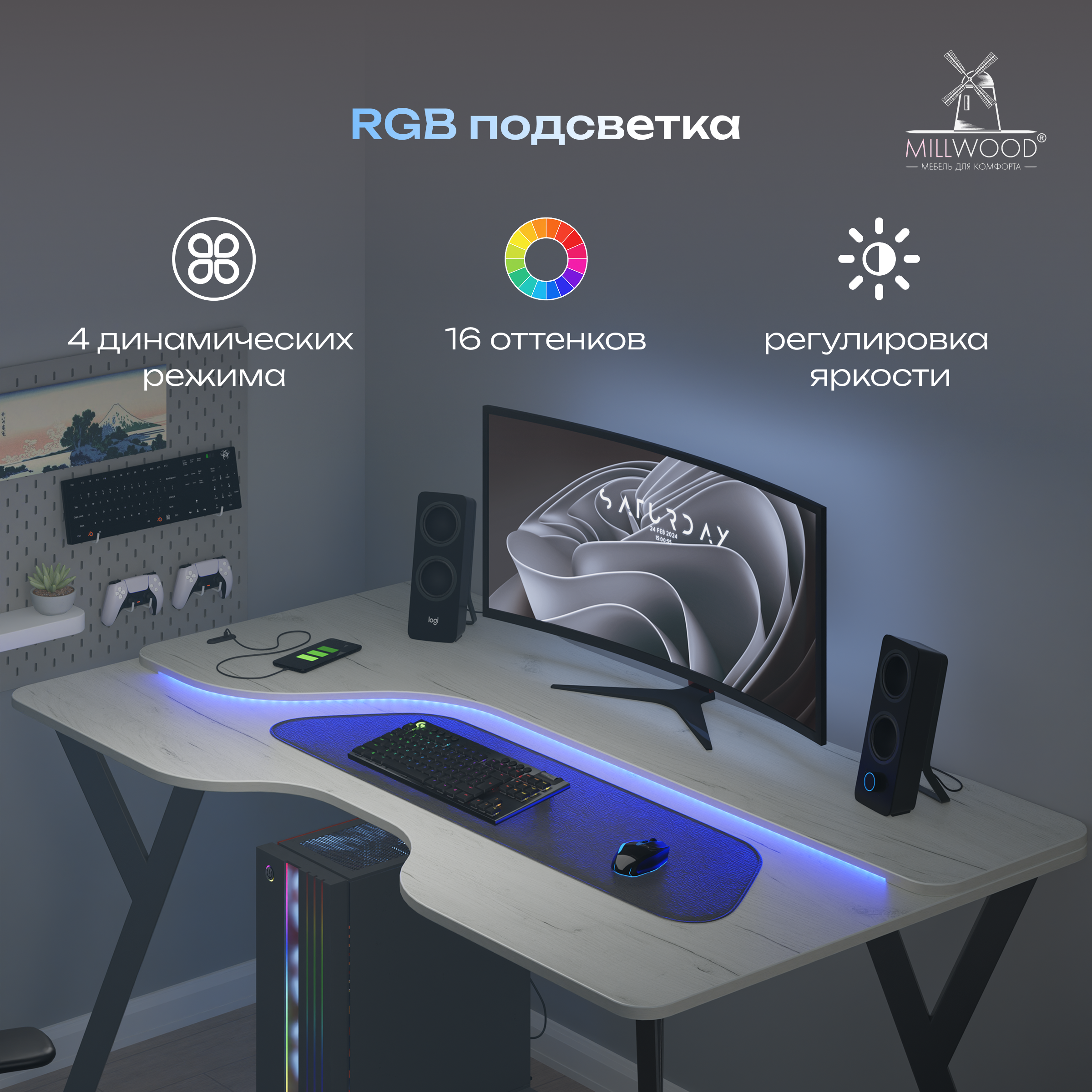 ◾ RGB‑подсветка с пультом: 16 оттенков, 4 динамических режима и плавная регулировка яркости — создаёт атмосферу уюта и визуального фокуса.
