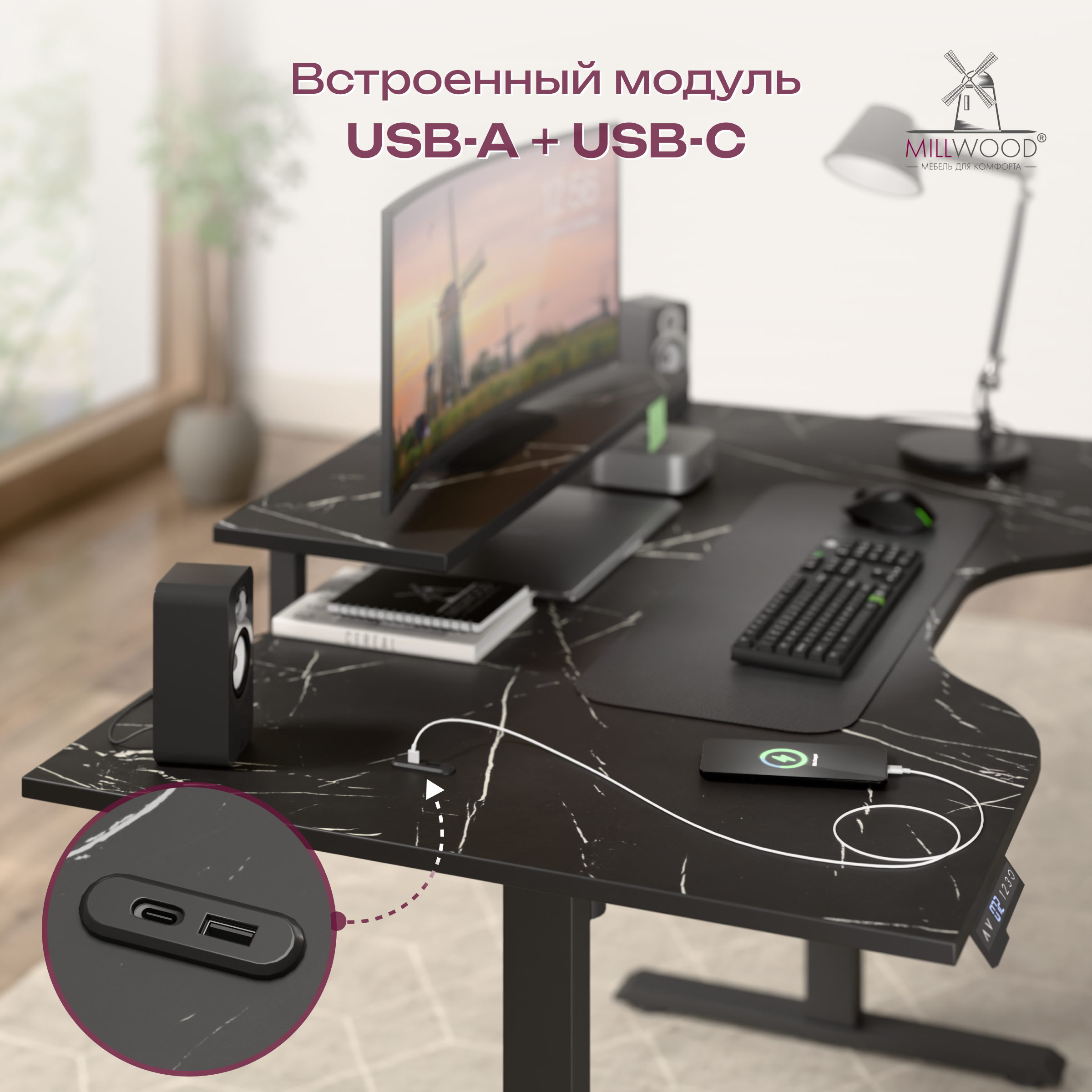 ◾ Встроенные USB-разъёмы Type-C и Type-A — зарядка устройств прямо на рабочем месте.