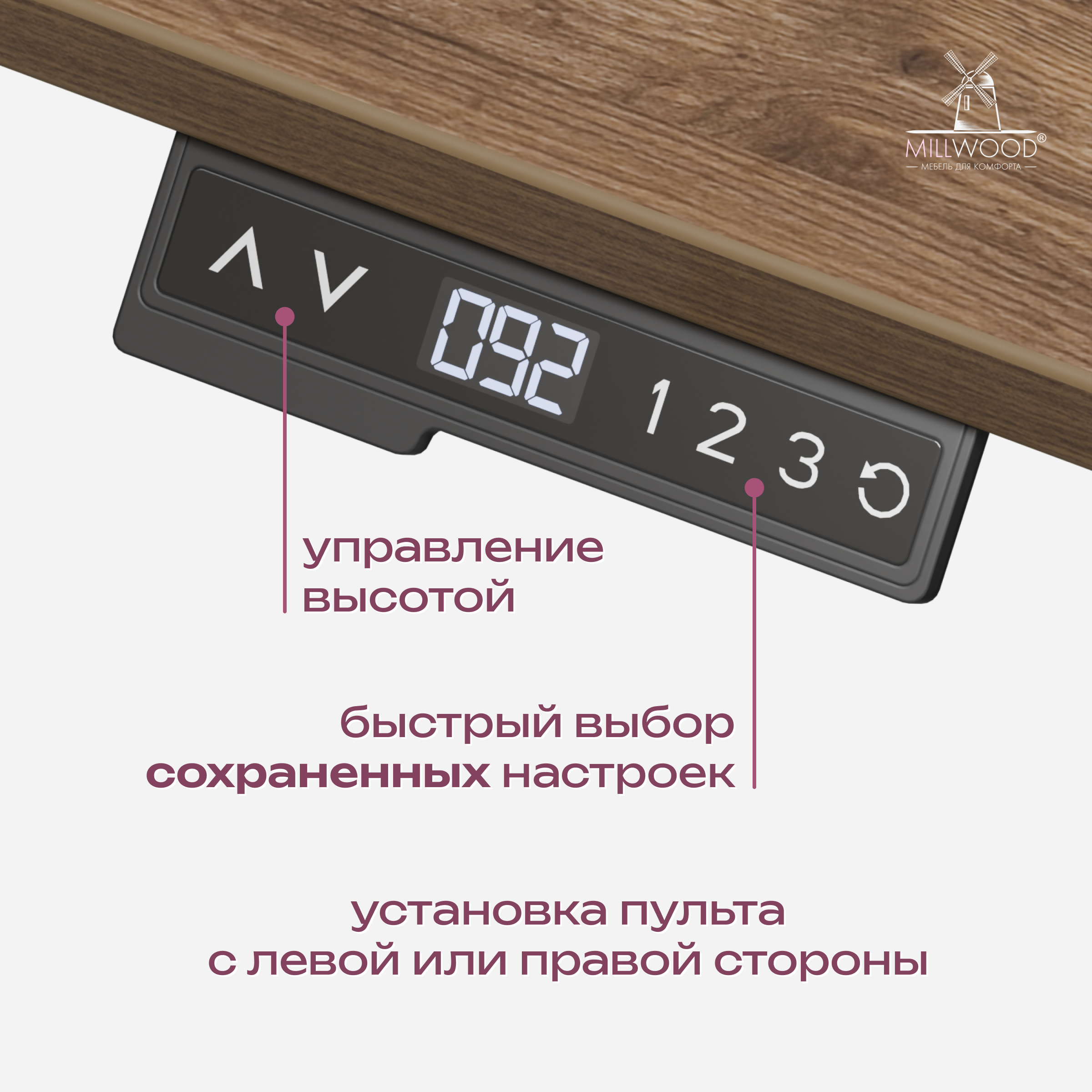 ◾ Пульт управления можно установить слева или справа; он оснащён кнопками подъёма и опускания, тремя ячейками памяти и функцией сброса.