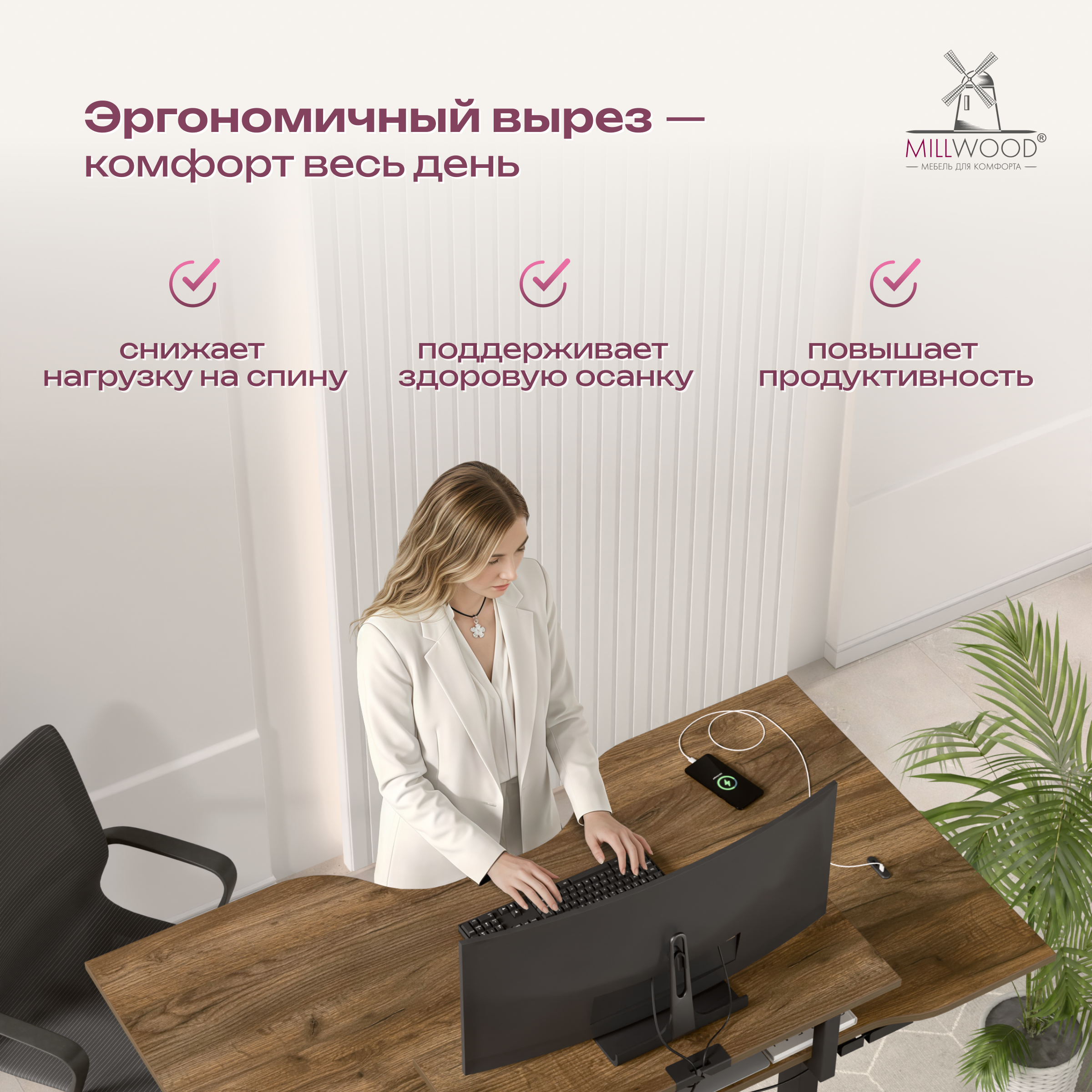 ◾ Анатомический вырез столешницы снижает нагрузку на позвоночник, уменьшая усталость и дискомфорт.
