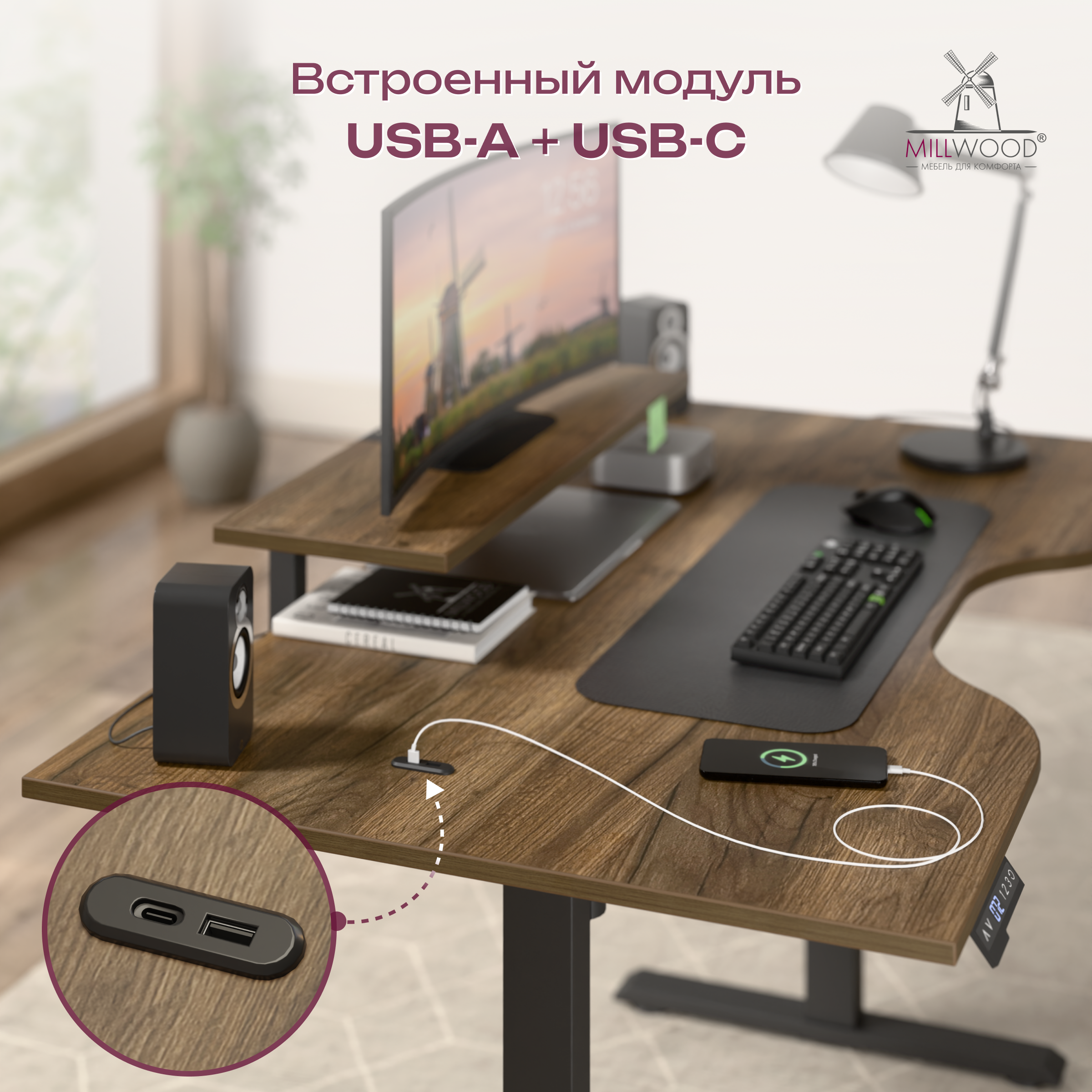◾ Встроенные USB-разъёмы Type-C и Type-A — зарядка устройств прямо на рабочем месте.