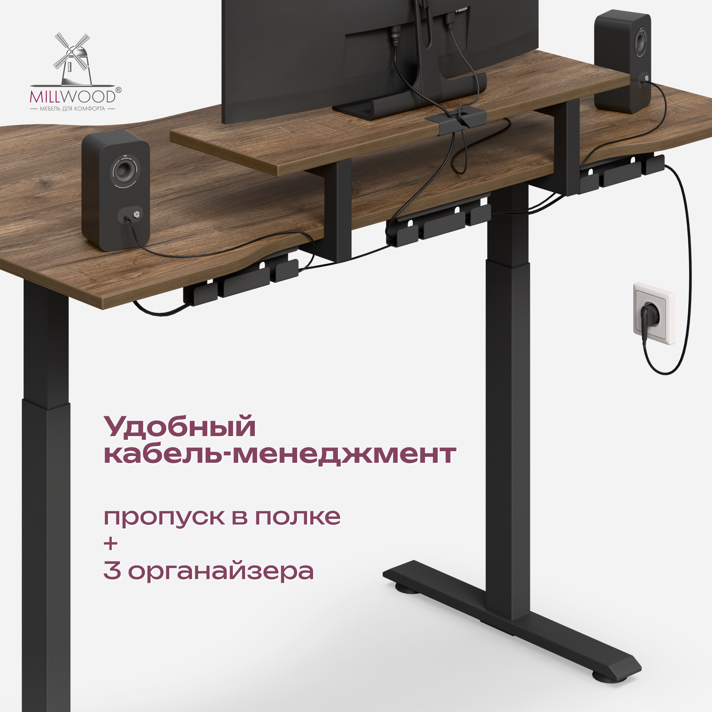 ◾ Подставка для монитора с пропуском для кабеля — экран всегда на уровне глаз, а рабочее место остаётся аккуратным. Подставку можно установить слева или справа, использовать как полку.