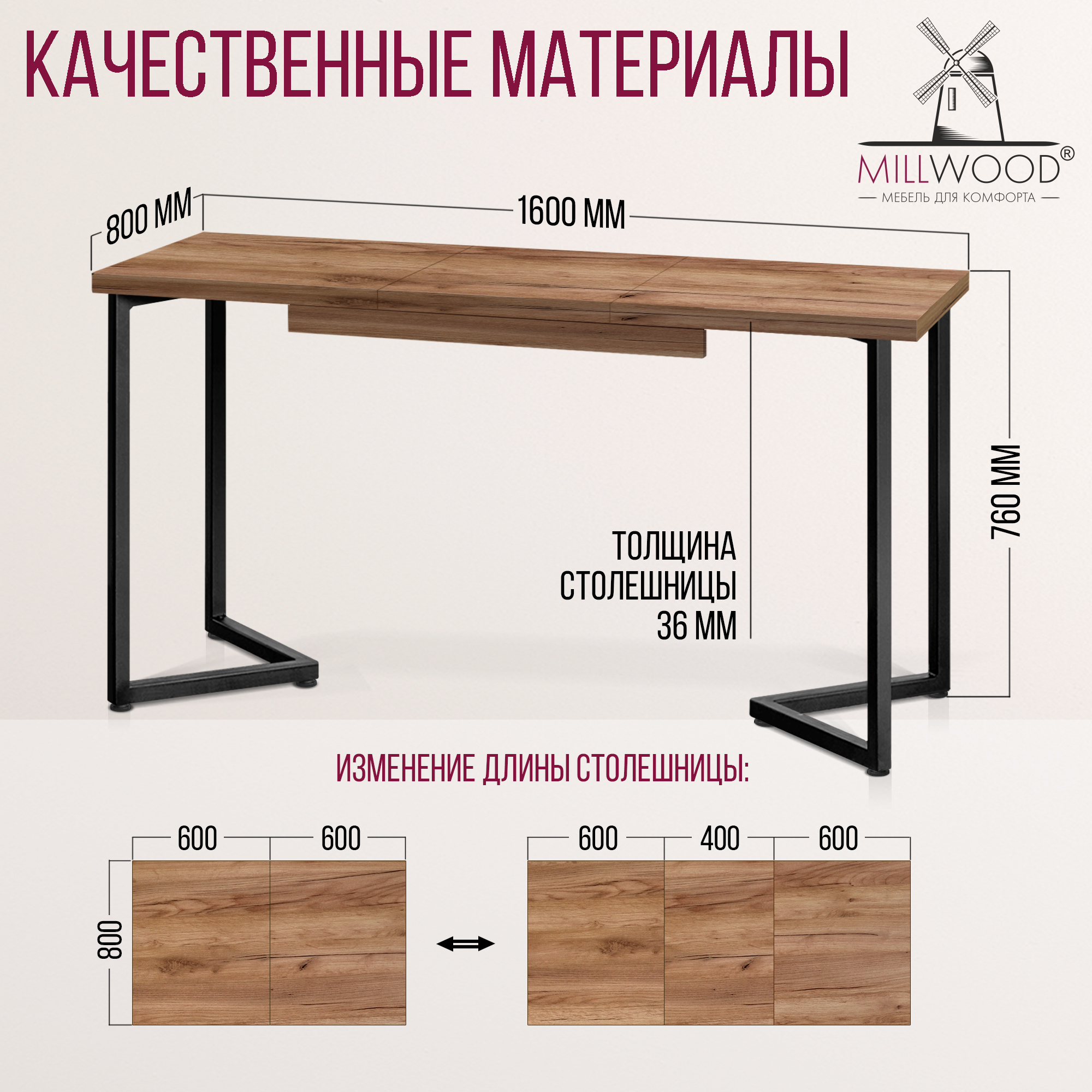 Прямоугольная столешница доступна в трех вариантах размеров: 100х60 см, 110х70 см и 120х80 см. Толщина столешницы 36 мм, выполнена из ЛДСП, материал обеспечивает превосходную прочность и устойчивость к повседневным воздействиям. Благодаря этому вы можете наслаждаться столом с должным уровнем комфорта, а элегантный внешний вид стола будет радовать вас долгие годы.