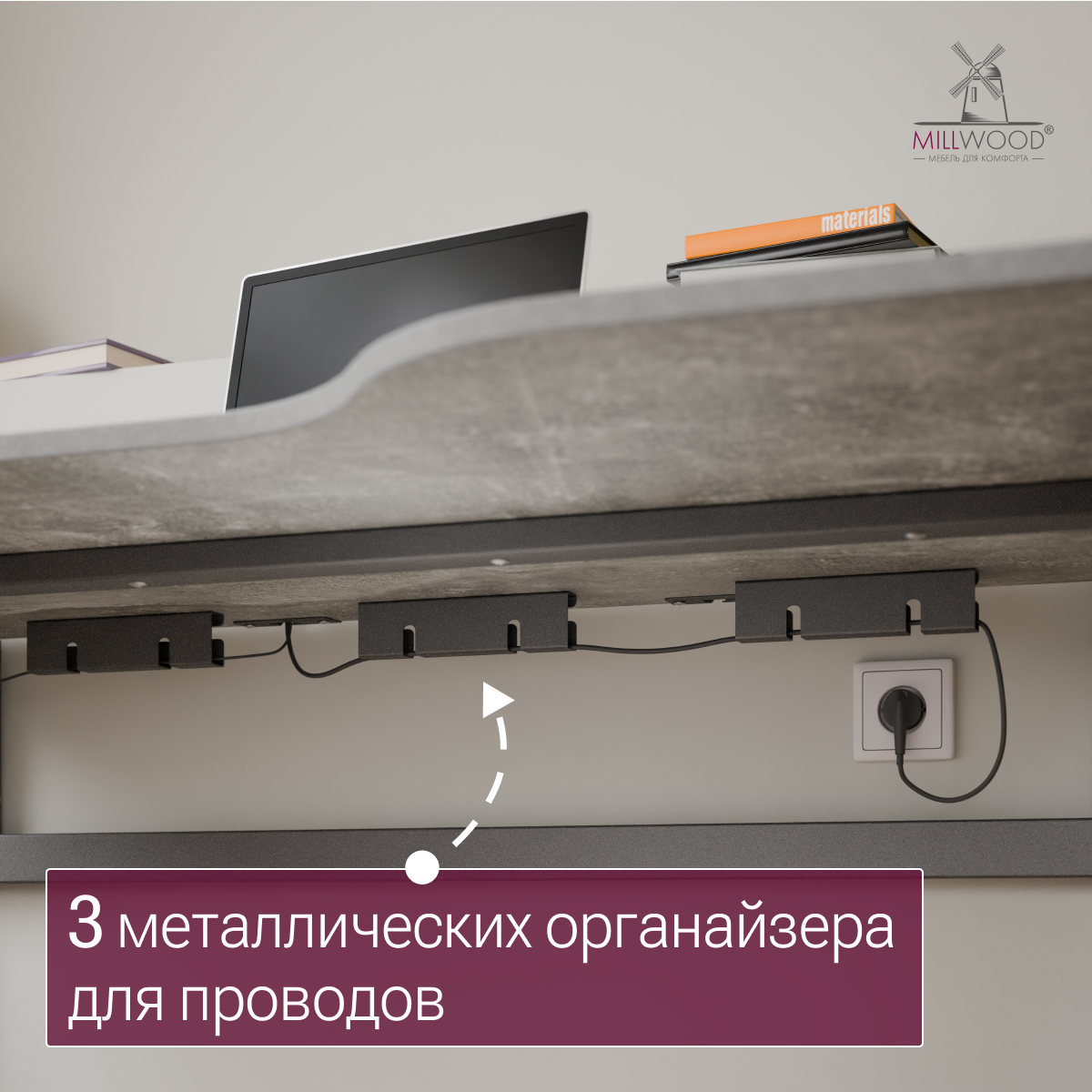 ◾ Три металлических органайзера — фиксируют провода под столом, предотвращая спутывание и обеспечивая порядок в зоне подключения.