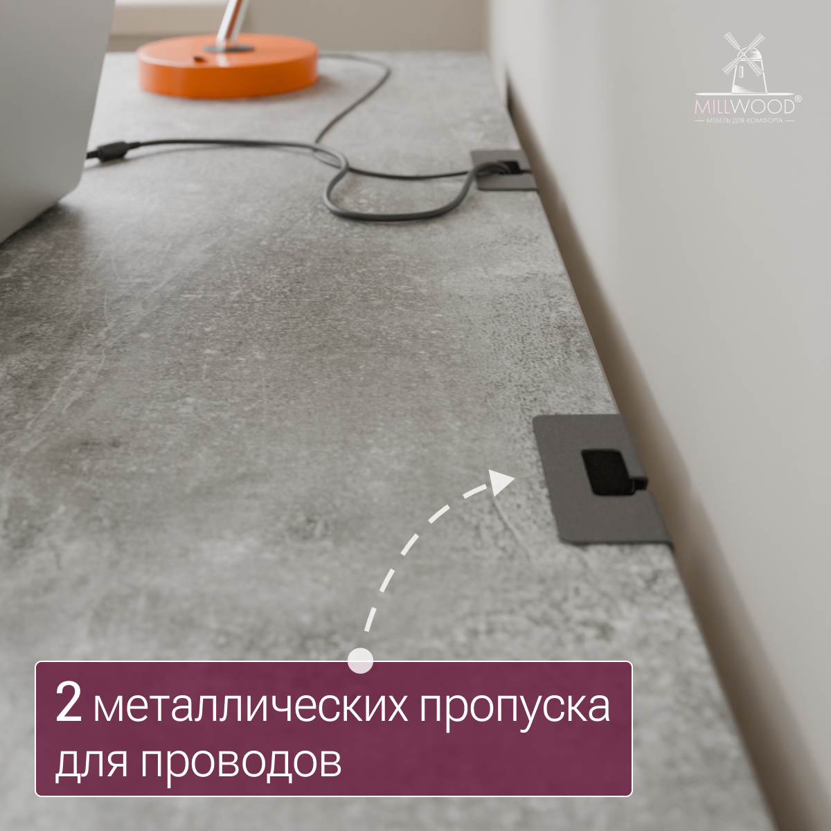 ◾ Два металлических пропуска для проводов — позволяют незаметно провести провода через столешницу, сохраняя рабочее пространство свободным.