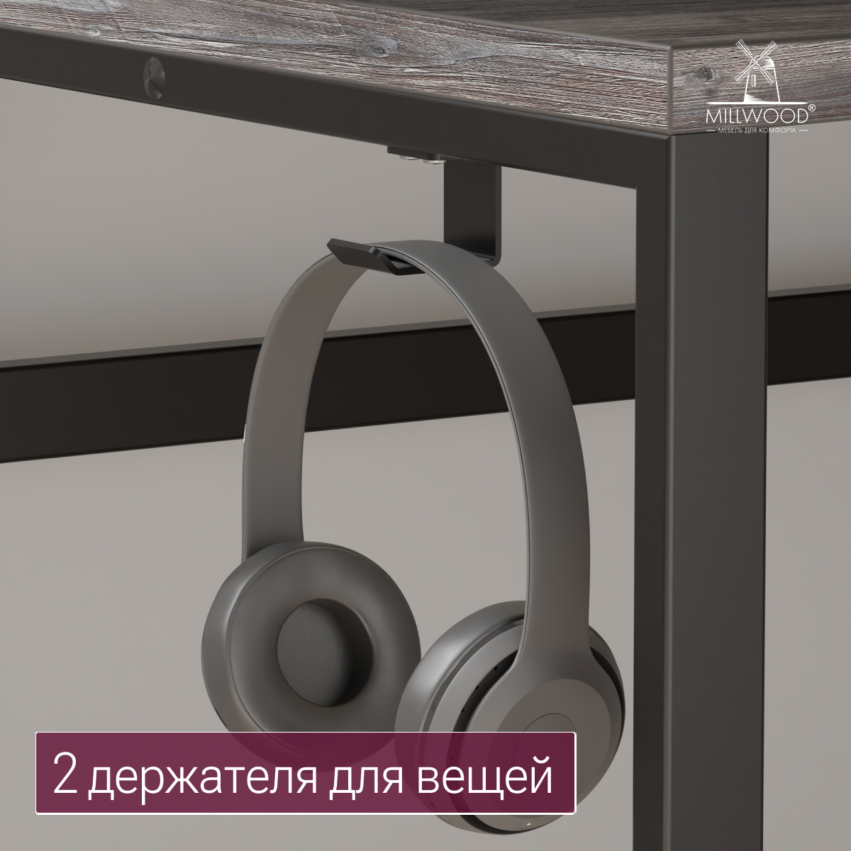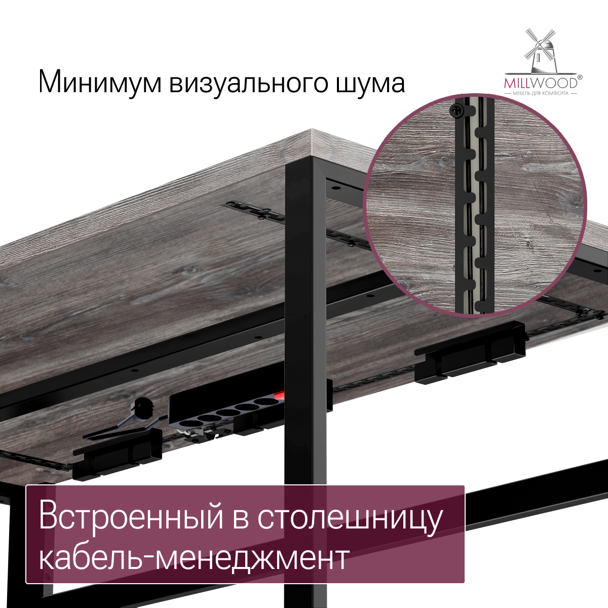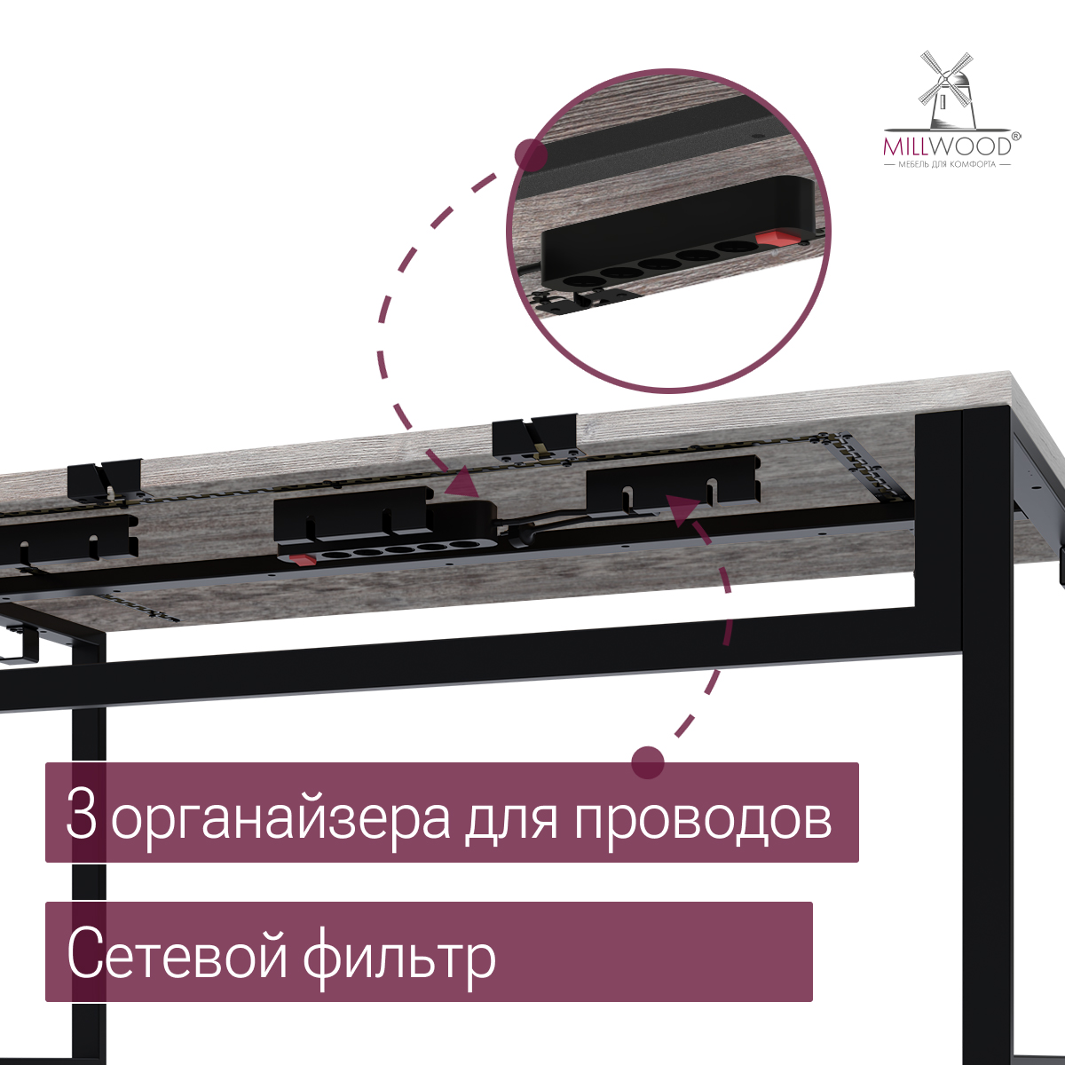 Для удобной организации пространства стол оборудован пропуском для кабелей и двумя металлическими органайзерами, которые помогут аккуратно уложить провода и избежать путаницы. Также под столешницей предусмотрен сетевой фильтр на 5 розеток — это обеспечивает достаточное количество подключений для всех ваших устройств.
