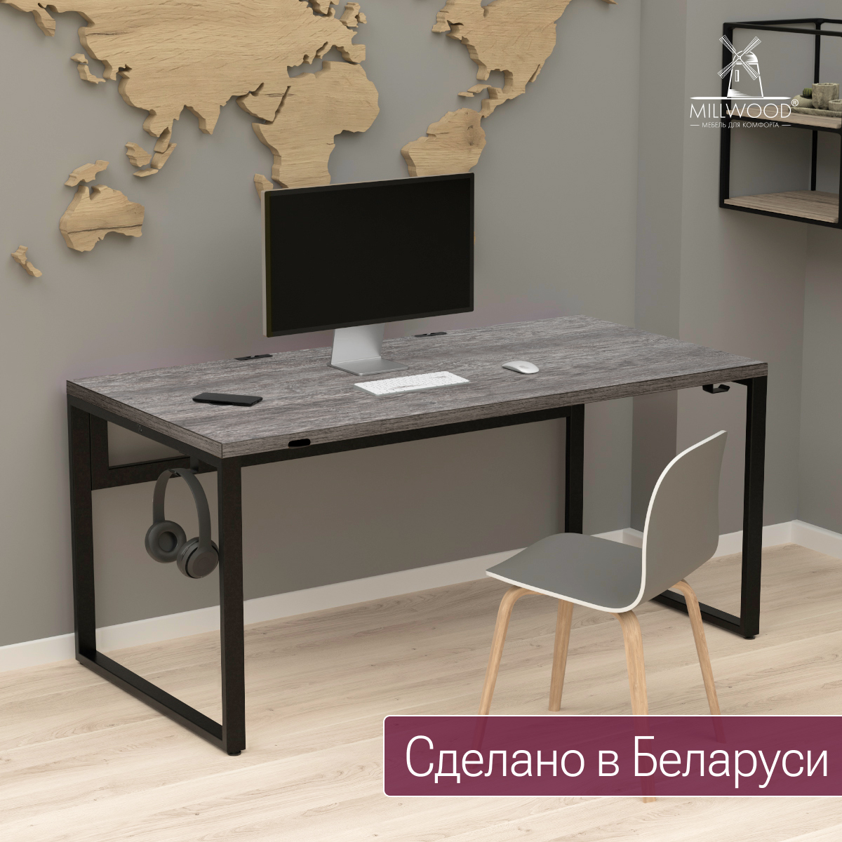 В комплекте идут все необходимые элементы для сборки: столешница с зарядкой и USB, подстолье, органайзеры для проводов, сетевой фильтр, держатели для вещей и инструкция.