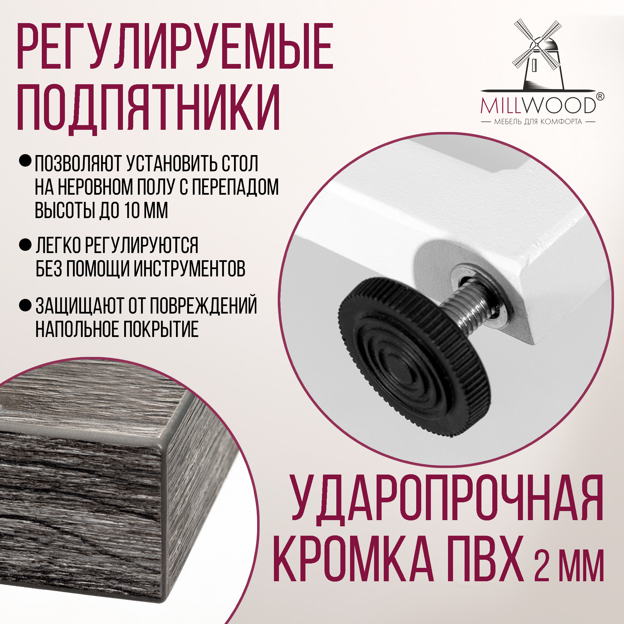 Прямоугольная столешница доступна в трех вариантах размеров: 100х60 см, 110х70 см и 120х80 см. Толщина столешницы 36 мм, выполнена из ЛДСП, материал обеспечивает превосходную прочность и устойчивость к повседневным воздействиям. Благодаря этому вы можете наслаждаться столом с должным уровнем комфорта, а элегантный внешний вид стола будет радовать вас долгие годы.