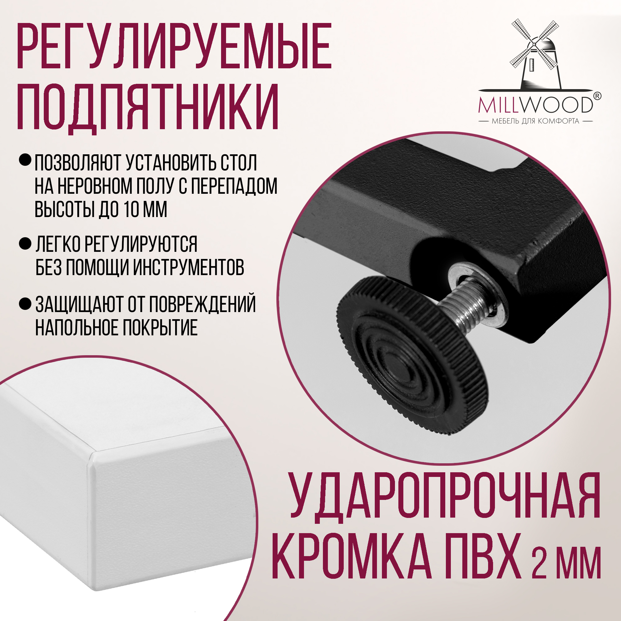 Прямоугольная столешница доступна в трех вариантах размеров: 100х60 см, 110х70 см и 120х80 см. Толщина столешницы 36 мм, выполнена из ЛДСП, материал обеспечивает превосходную прочность и устойчивость к повседневным воздействиям. Благодаря этому вы можете наслаждаться столом с должным уровнем комфорта, а элегантный внешний вид стола будет радовать вас долгие годы.