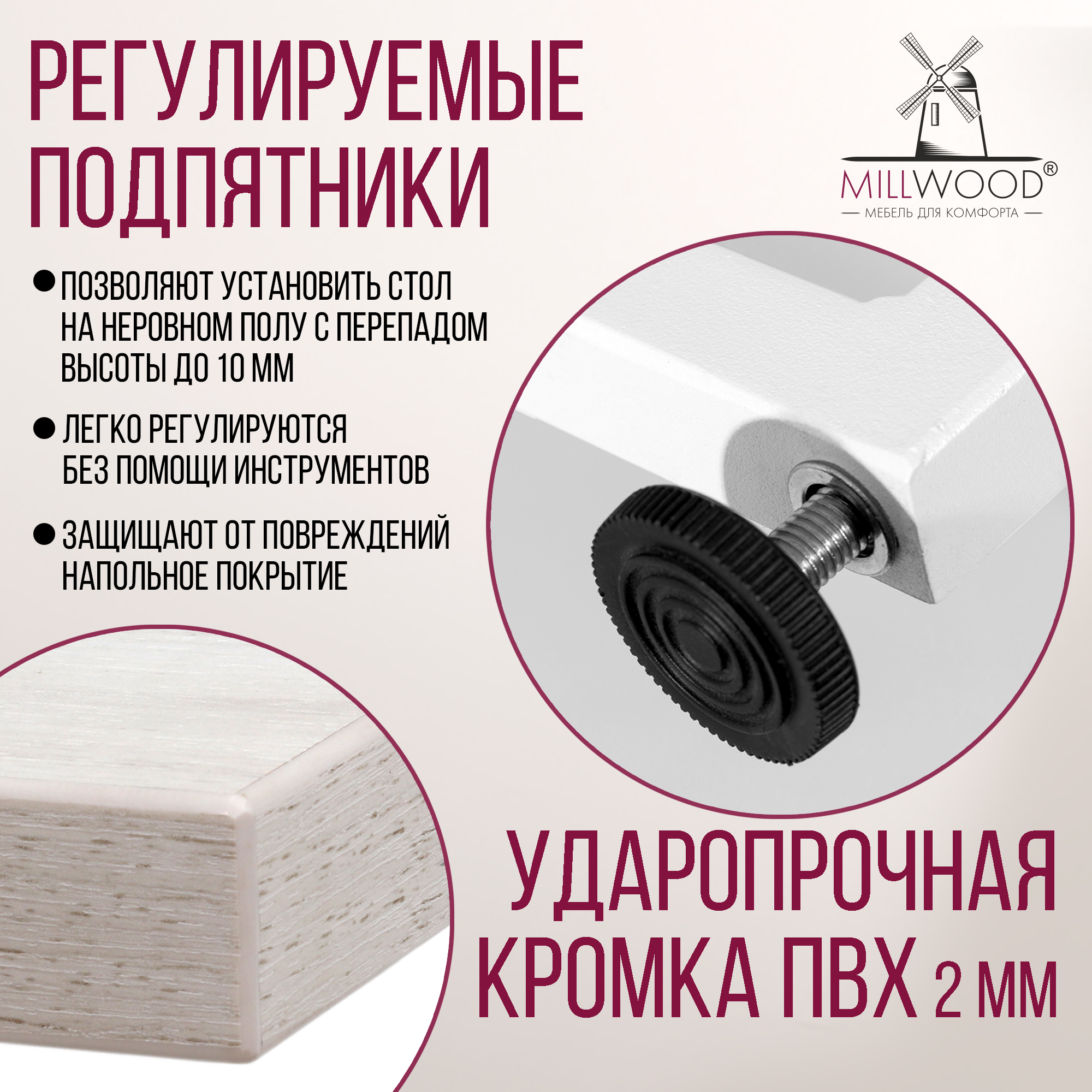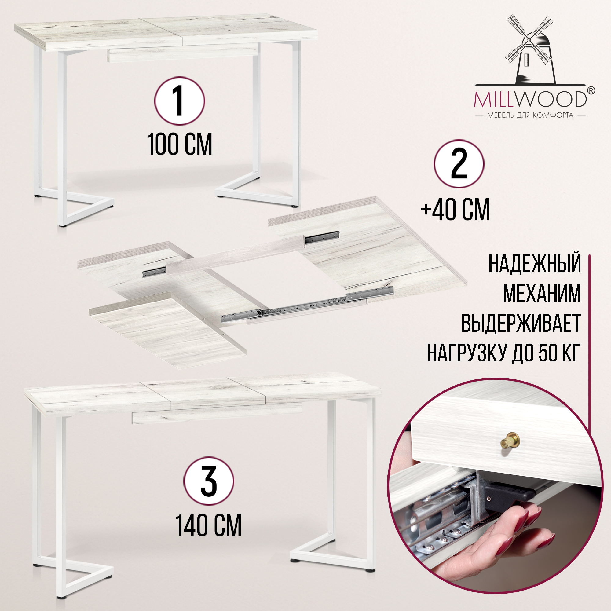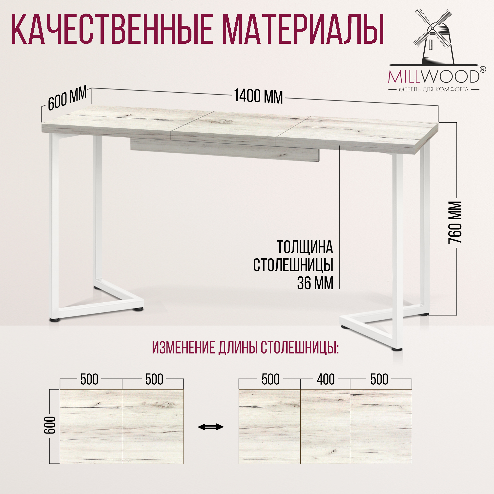 Прямоугольная столешница доступна в трех вариантах размеров: 100х60 см, 110х70 см и 120х80 см. Толщина столешницы 36 мм, выполнена из ЛДСП, материал обеспечивает превосходную прочность и устойчивость к повседневным воздействиям. Благодаря этому вы можете наслаждаться столом с должным уровнем комфорта, а элегантный внешний вид стола будет радовать вас долгие годы.