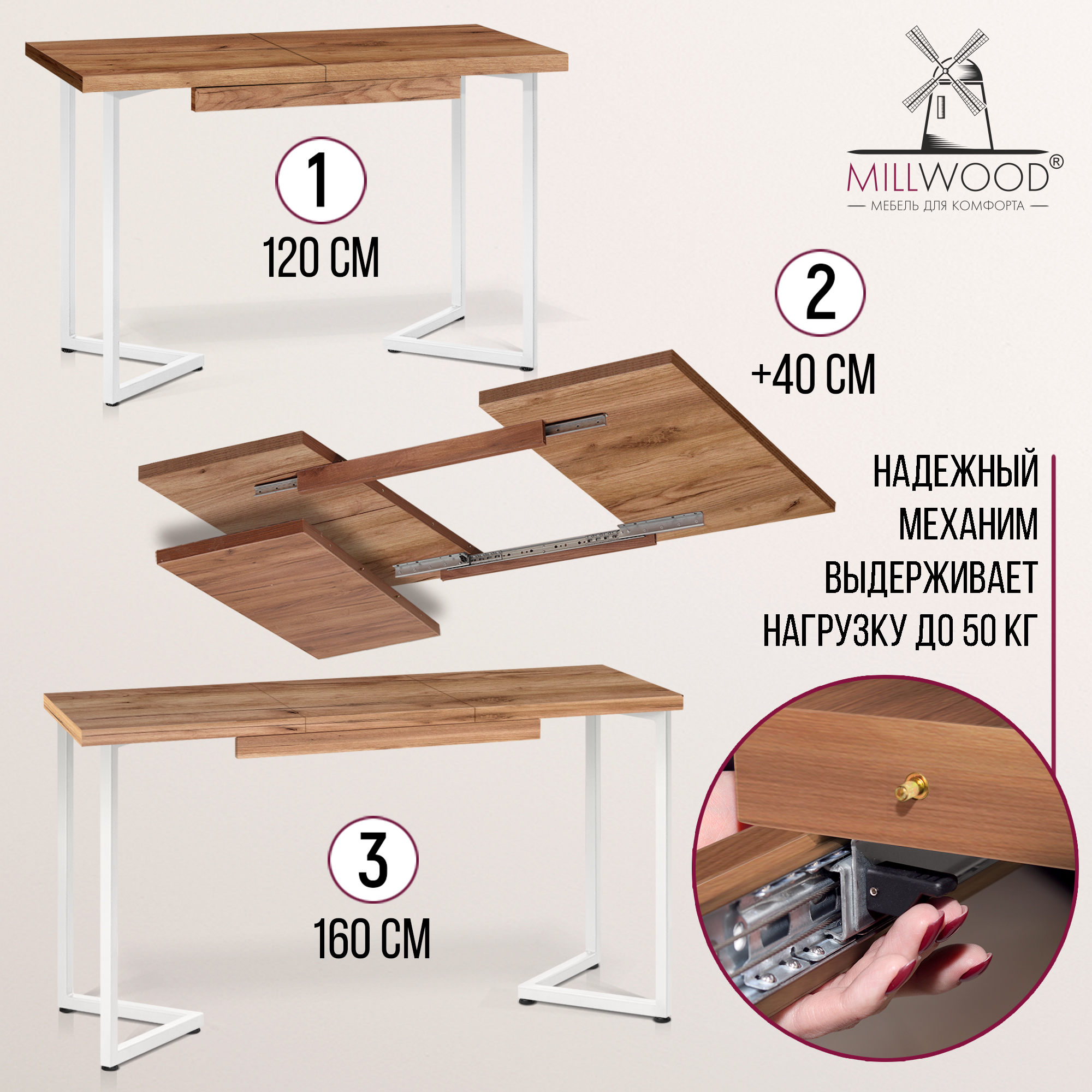 Прямоугольная столешница доступна в трех вариантах размеров: 100х60 см, 110х70 см и 120х80 см. Толщина столешницы 36 мм, выполнена из ЛДСП, материал обеспечивает превосходную прочность и устойчивость к повседневным воздействиям. Благодаря этому вы можете наслаждаться столом с должным уровнем комфорта, а элегантный внешний вид стола будет радовать вас долгие годы.