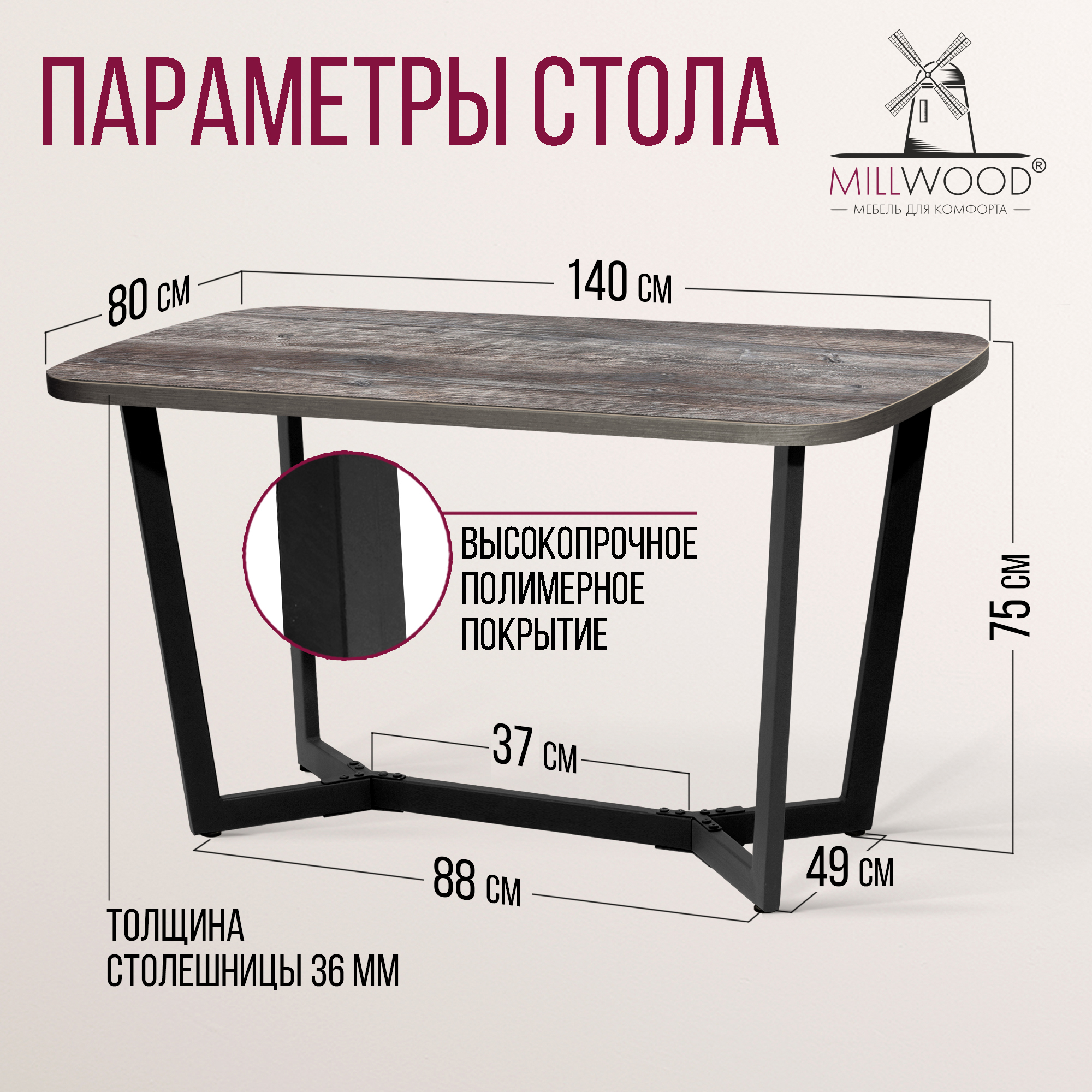 - столешница: прямоугольная с закругленными краями из ЛДСП толщиной 36 мм;