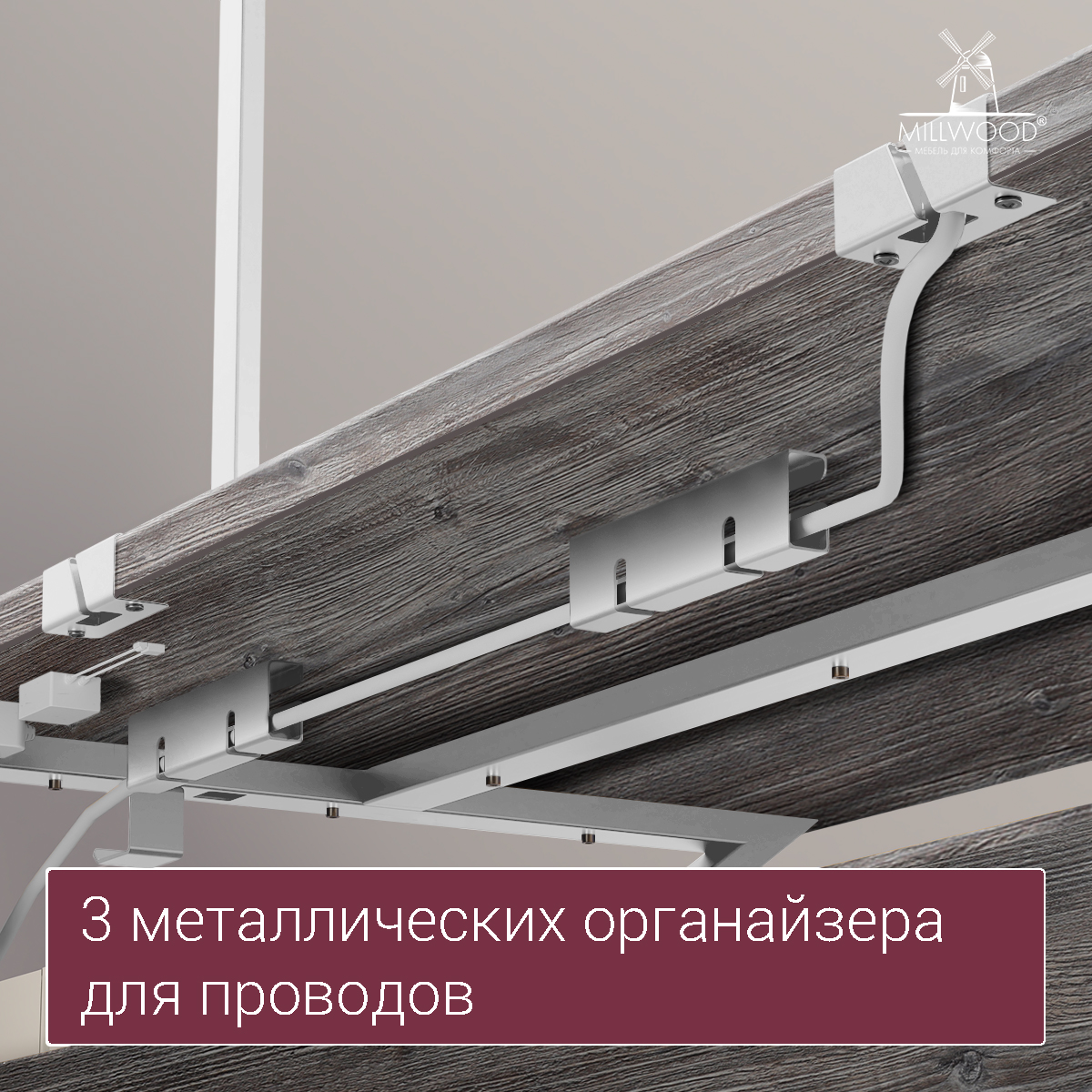 ◾ Три металлических органайзера фиксируют провода под столом, предотвращая спутывание и поддерживая порядок.