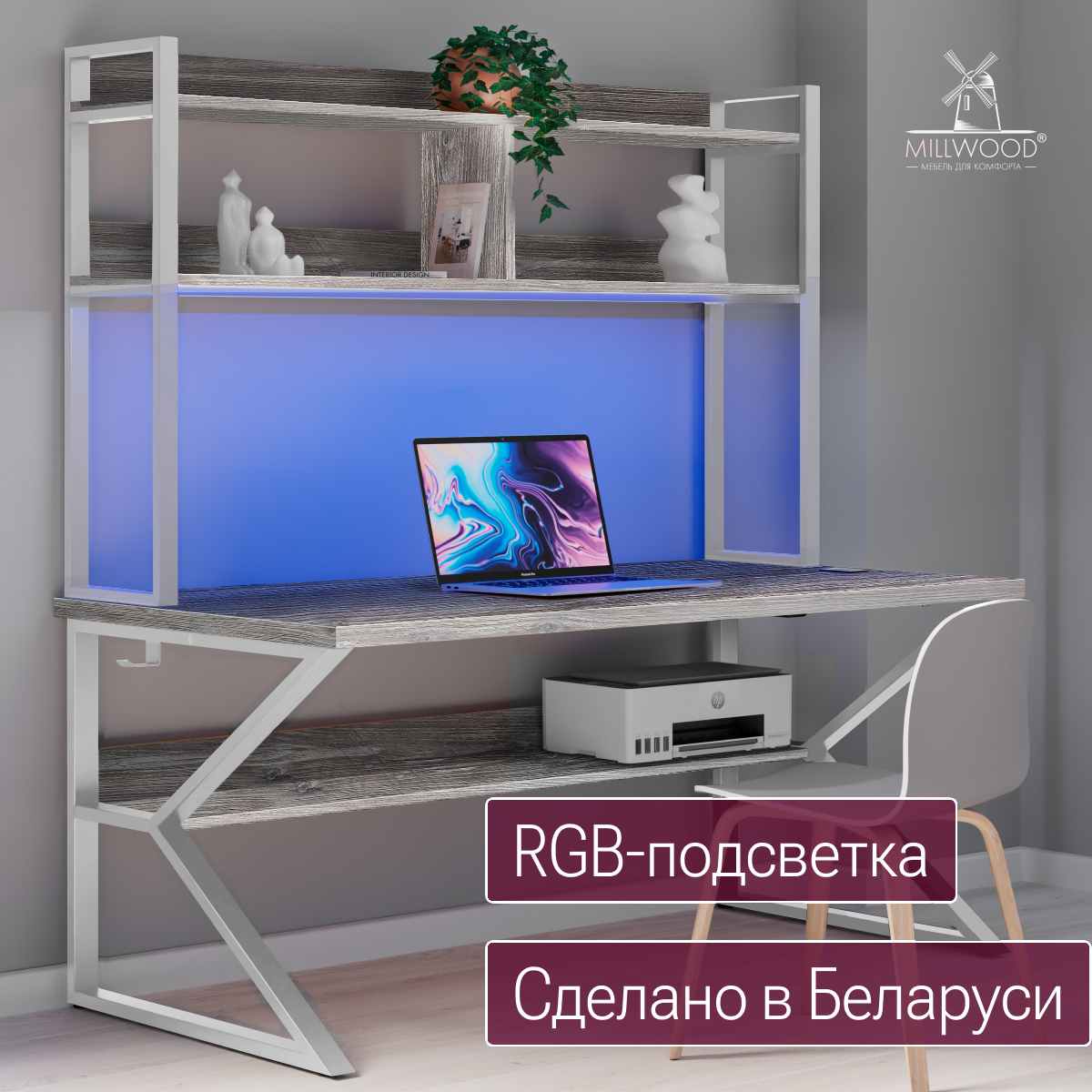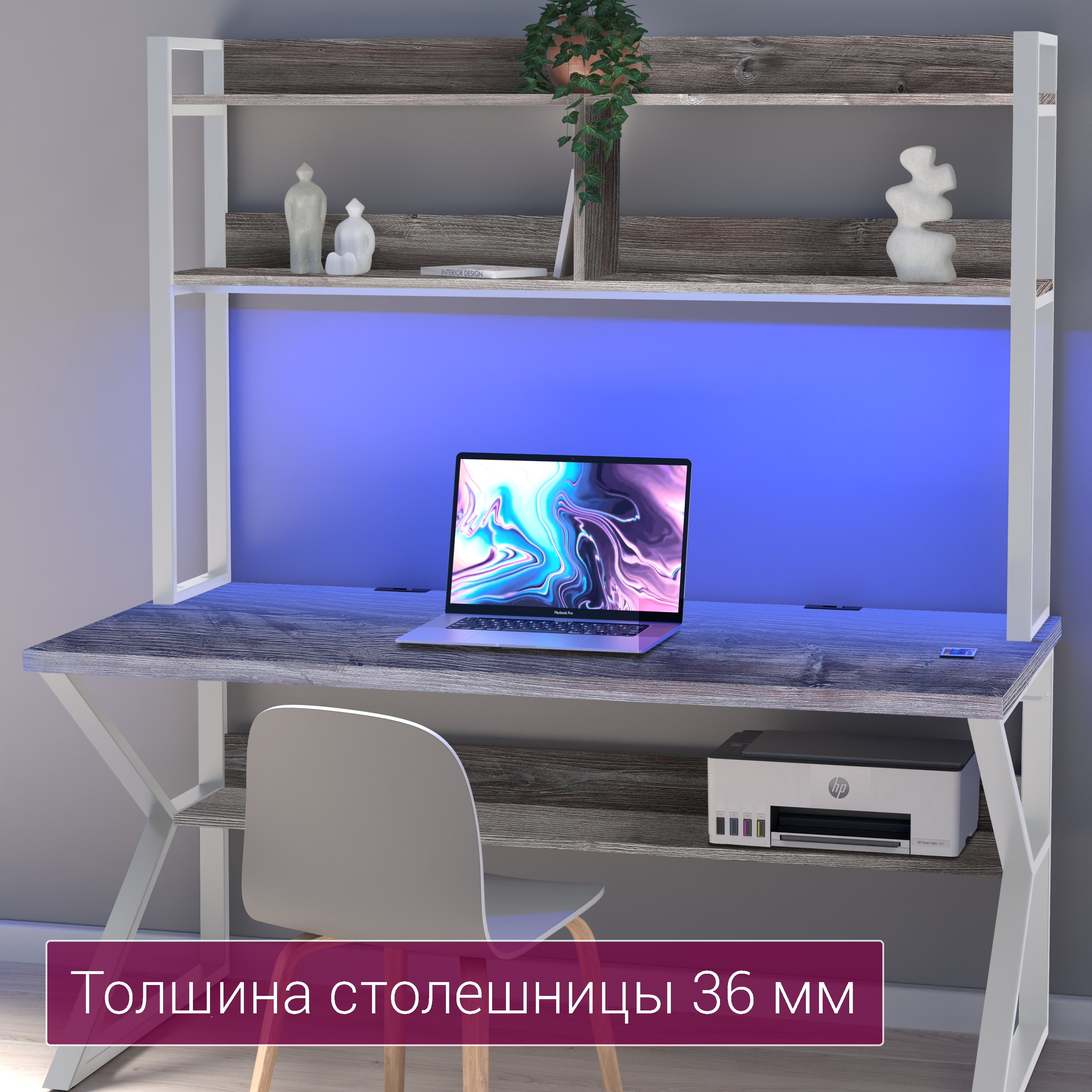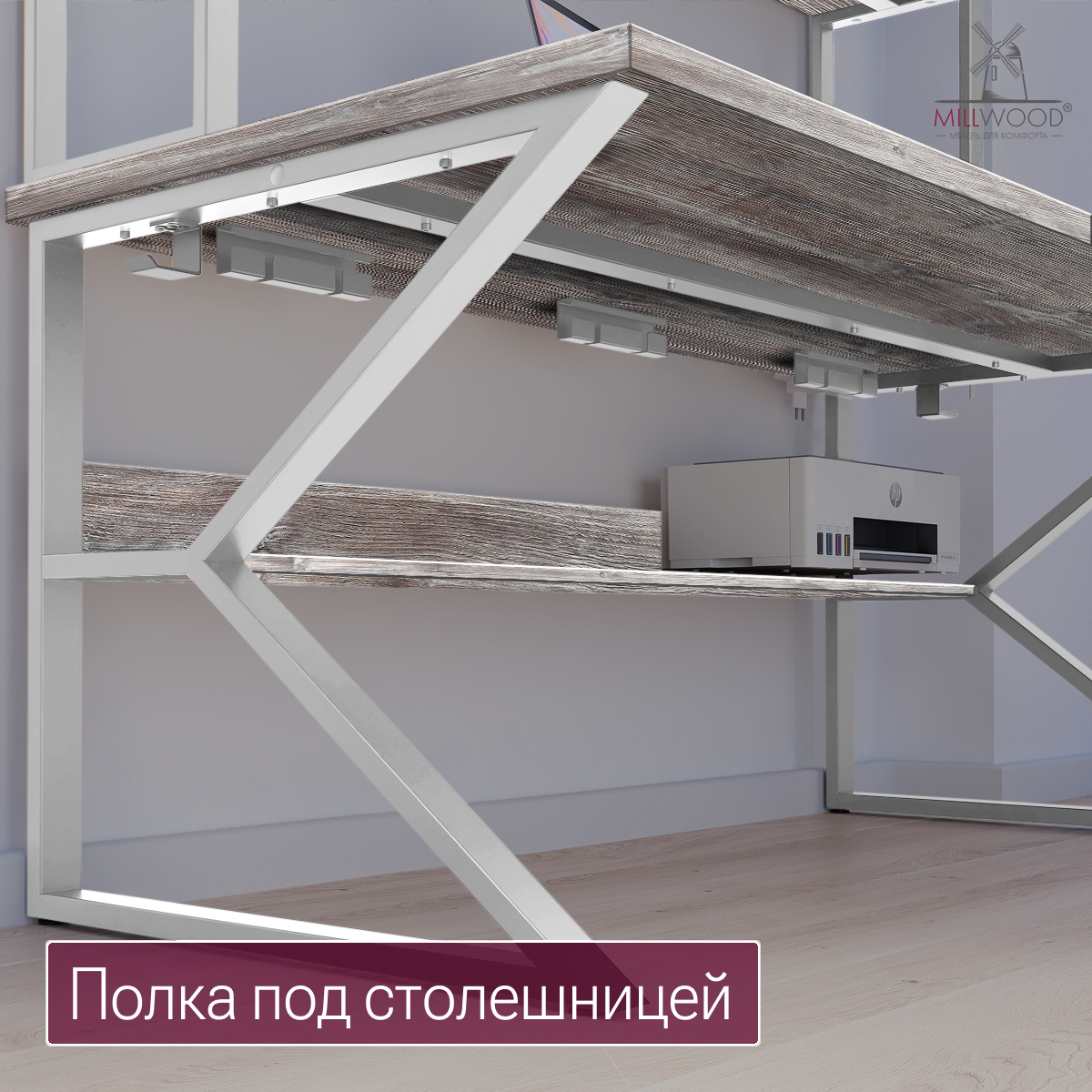 ◾ Полка под столешницей — скрытая зона для роутера, принтера, блоков питания и других предметов, поддерживающая порядок и визуальную лёгкость.