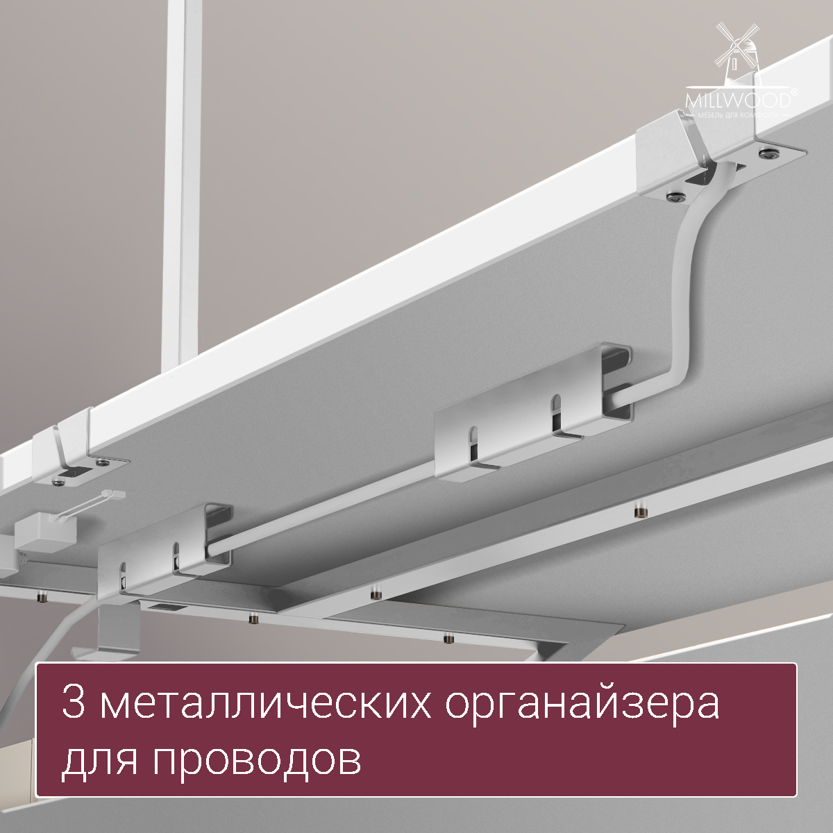 ◾ Три металлических органайзера фиксируют провода под столом, предотвращая спутывание и поддерживая порядок.