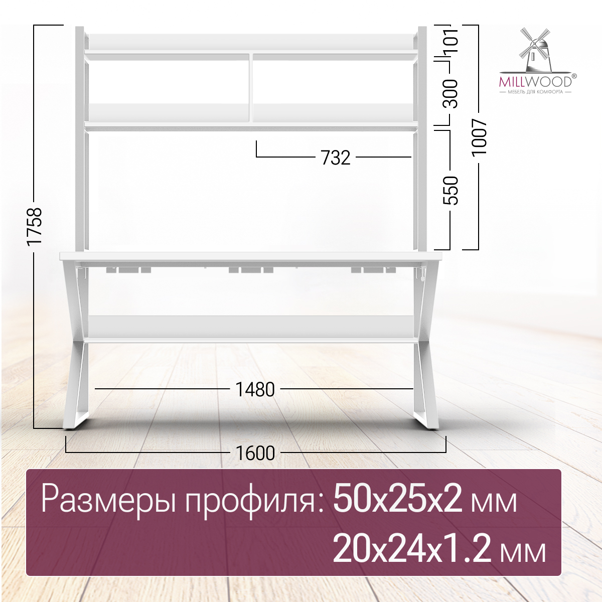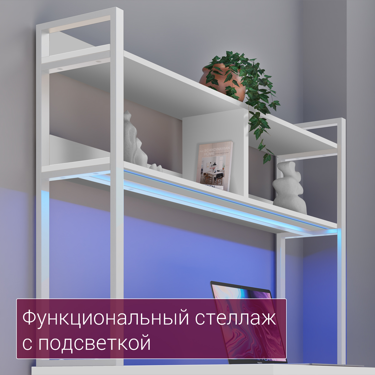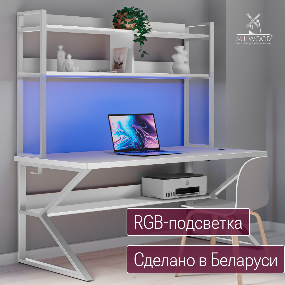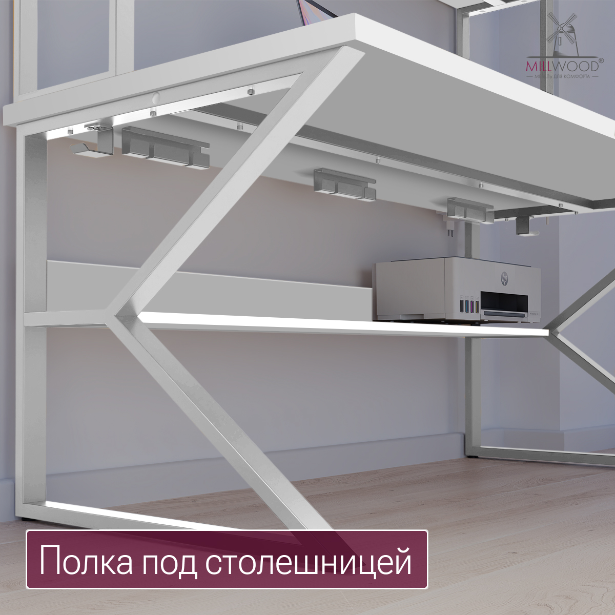 ◾ Полка под столешницей — скрытая зона для роутера, принтера, блоков питания и других предметов, поддерживающая порядок и визуальную лёгкость.